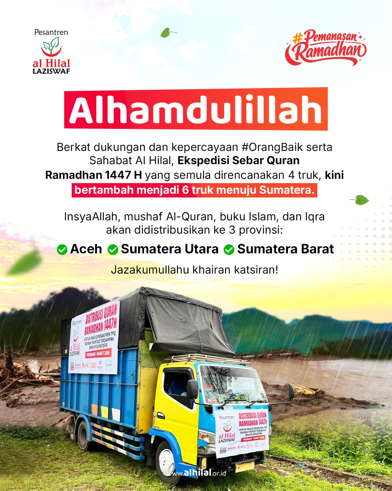 Selain itu, truck sebar Qur’an tiba di Aceh Tamiang untuk mendistribusikan mushaf dan bantuan logistik kepada para penyintas. Kemudian, bantuan mushaf Qur’an berhasil didistribusikan ke 10 lembaga Islam di wilayah tersebut. Akibatnya, santri-santri di pesantren yang terdampak bencana dapat kembali melanjutkan aktivitas tahfidz mereka.