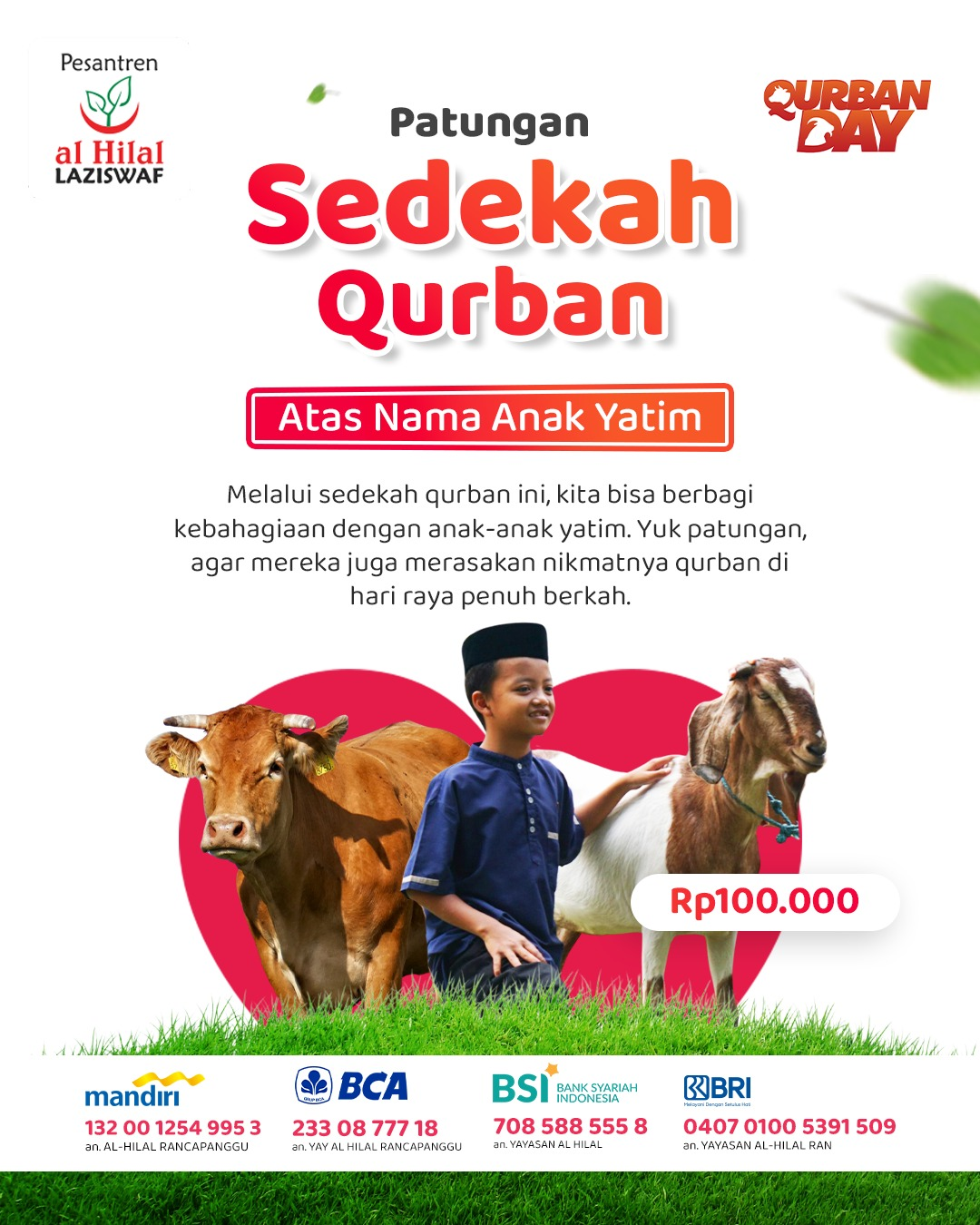 Melihat hal tersebut, LAZISWAF Pesantren Al Hilal mengajak seluruh sahabat untuk turut ambil bagian dalam program “Sedekah Qurban”. Melalui program ini, kita bisa patungan untuk menghadirkan kebahagiaan bagi anak-anak yatim, agar mereka juga dapat merasakan nikmatnya berqurban di hari raya yang penuh berkah.